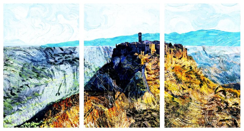 Richiamo alla pittura di Van Gogh; la misura dei pannelli è 60x 80 cm, per uno sviluppo orizzontale di circa 2 metri